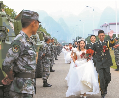 金秋十月,丹桂飘香。10月初的一天,第75集团军某旅隆重举办大型军营集体婚礼,30对新人在官兵和亲友的祝福中走进婚姻殿堂。