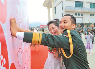 婚纱邂逅军装,浪漫交融忠诚。心愿墙下,一个个签名、一双双红手印、一张张合影,见证30对新人的风雨历程,留下他们的爱情印记。