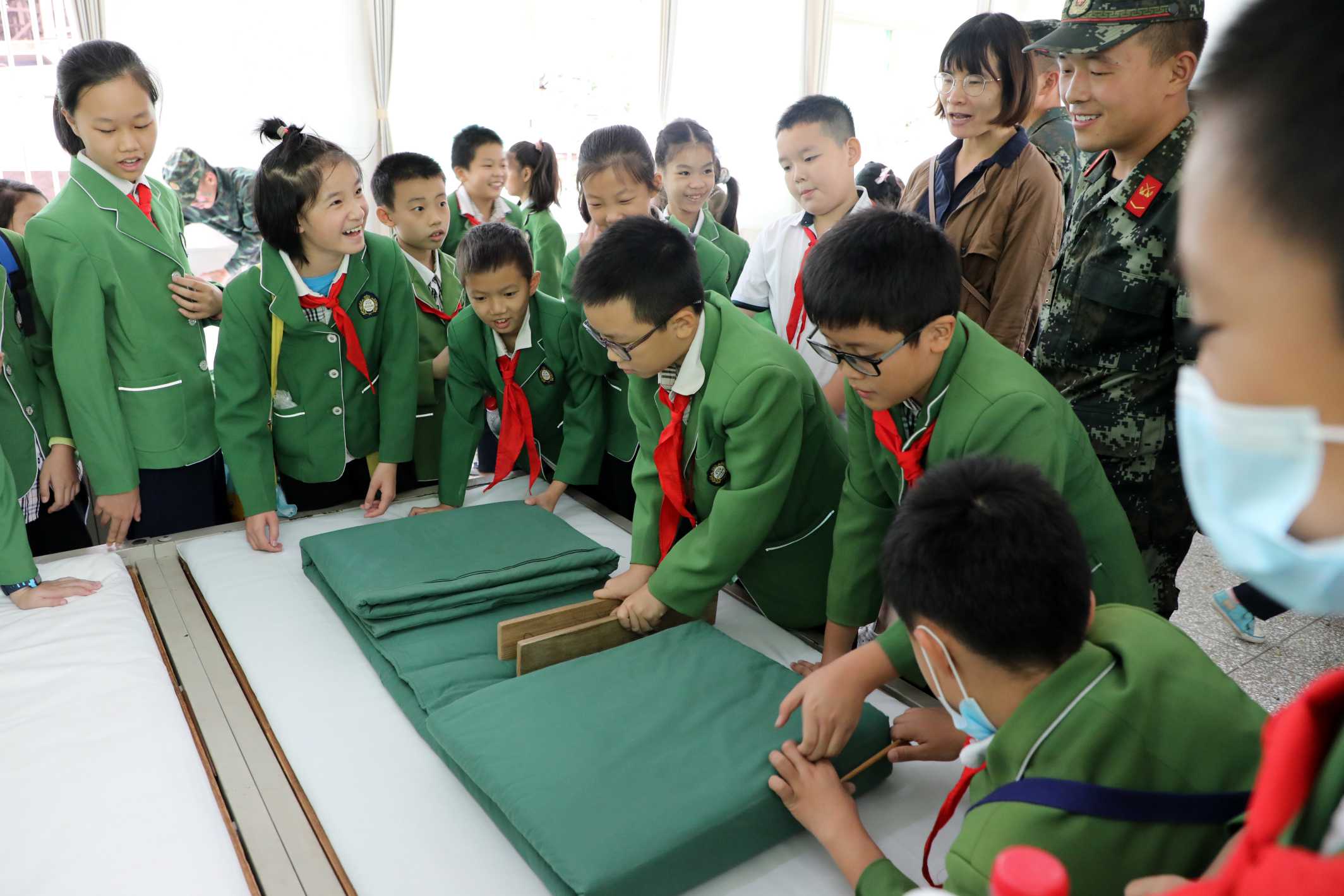 图为小朋友们在学习把被子叠成“豆腐块”。