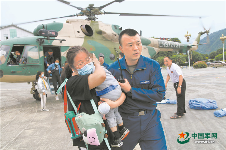 今天11时30分,第77集团军某旅救援机组再次飞抵绵阳市白马乡祥述加村上空,展开救援行动。