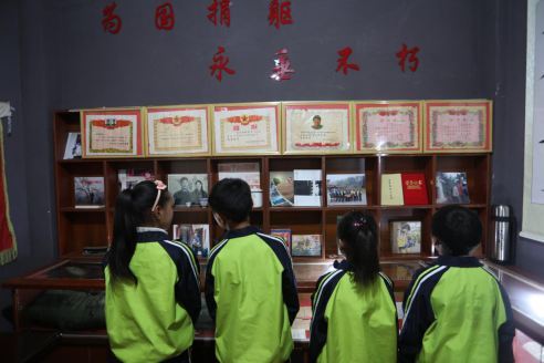 18日,在“梁三喜”原型王发坤烈士纪念馆内,遗孀李金花正在为前来参观的7名学生进行讲解。