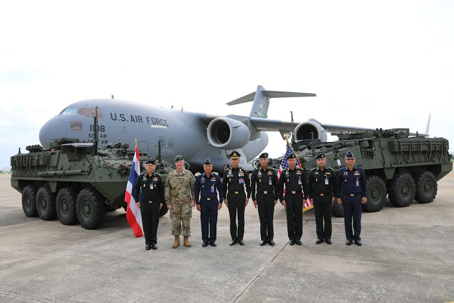 泰国陆军司令部在其官方社交媒体账号上表示,美国特种货运飞机将4辆装甲输送车运抵到曼谷廊曼空军基地。泰国陆军司令阿披叻将军和美国印度洋-太平洋司令部司令菲利普·戴维森上将在基地机场迎接了战车到来。