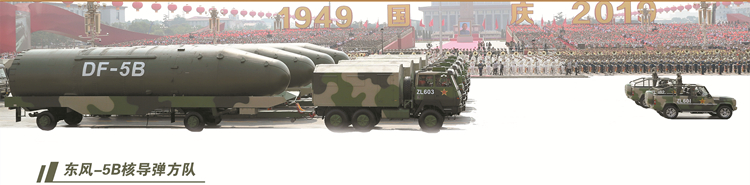 伴随着雄壮的阅兵进行曲,迎面而来的是东风-5B核导弹方队。该方队领队为汪晓初少将和邓荣珍少将。作为我国大国地位、国防实力的显著标志,维护国家安全、主权和捍卫民族尊严的战略重拳,从“9·3”胜利日阅兵首次亮相天安门广场后,蛰伏数载的该型导弹,今天再次吸引了世人万千目光。