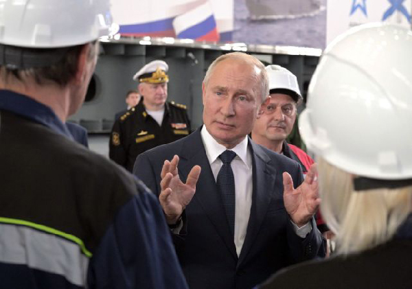 资料图:普京(中)在克里米亚刻赤“海湾”造船厂与工人交谈