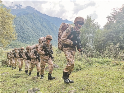 高山峡谷间,一队全副武装的巡逻官兵穿丛林、爬陡坡,向着点位进发。