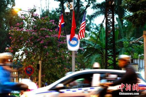 2月25日,越南首都河内街头悬挂越南、美国、朝鲜三国国旗。