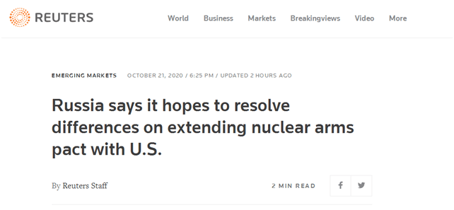 路透社表示,如果不延长《新削减战略武器条约》,有关限制将不再继续,这可能会引发冷战后的军备竞赛,加剧这两个世界上最大的核武器大国之间的紧张关系。报道还说,尽管俄美双方都发出了乐观信号,但有分析人士表示,在距离美总统大选不到两周的时间之前,双方很难就详细的有关程序进行谈判。
