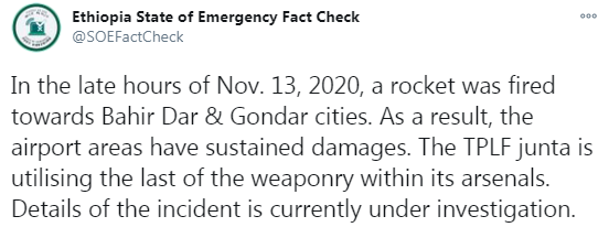 据埃塞联邦政府消息,当地时间11月13日深夜,提格雷人民解放阵线(“提人阵”)军政府向巴哈达尔市和贡德尔市方向发射了一枚火箭弹,导致机场区域遭到持续性破坏。联邦政府称,这是提格雷军政府武器库中的“终极武器”。目前详细信息正在调查中。
