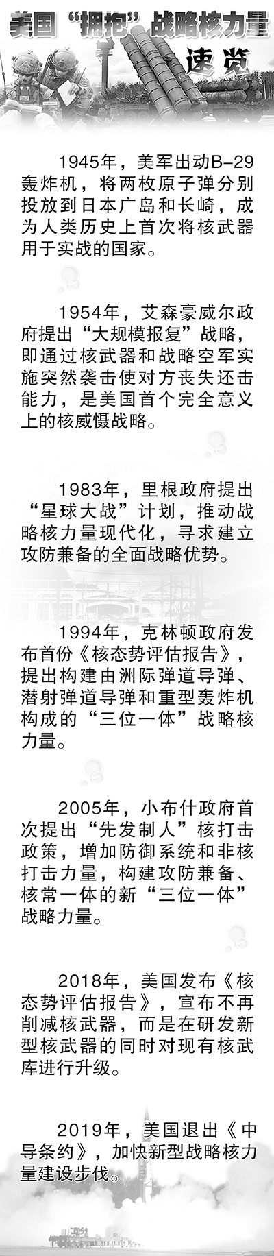 近年来,美国持续改进现役战略导弹,大力发展下一代战略威慑武器,维护核大国的霸权地位。美国谋求军事“绝对优势”动作频频,或将导致新一轮核军备竞赛,引发国际社会高度关注。