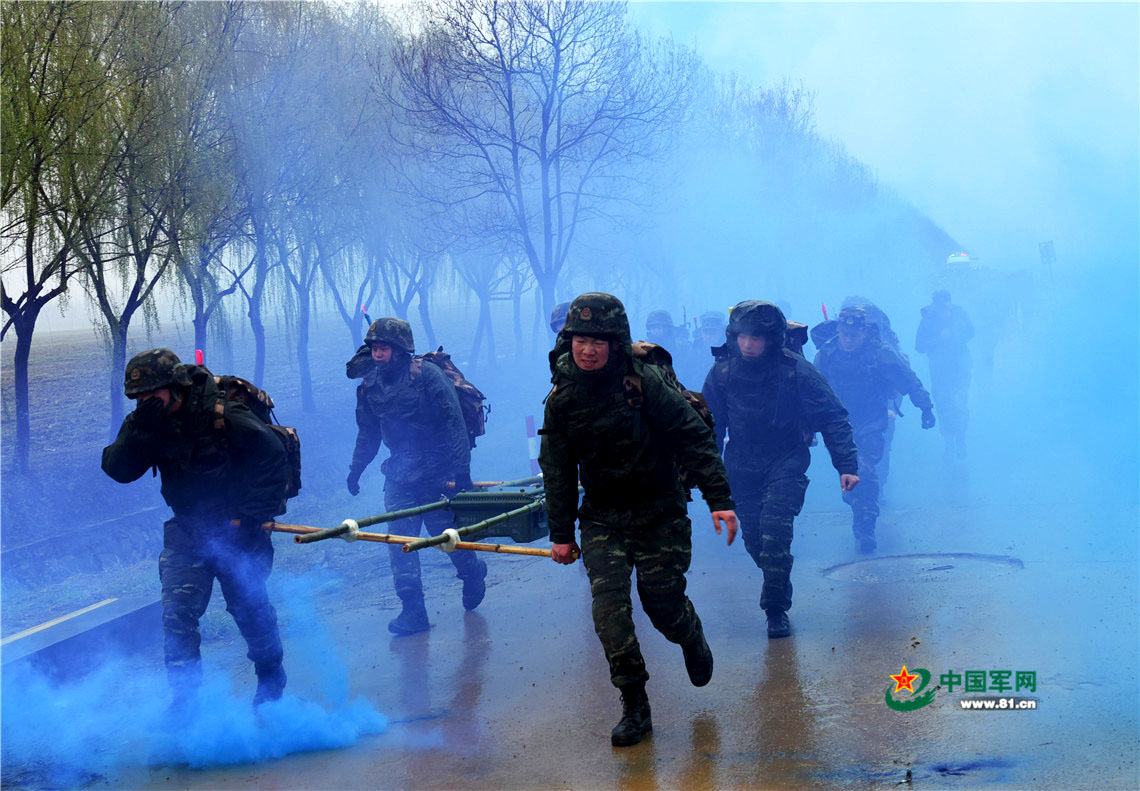 2018年3月20日,安徽合肥,武警特战队员快速通过“染毒”路段。