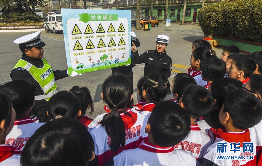 3月26日,河北省安平县交通警察大队民警为学生讲解交通安全知识。当日是第23个全国中小学生安全教育日,河北省安平县举办安全教育活动,提高学生们的安全自救意识。新华社记者 李晓果 摄