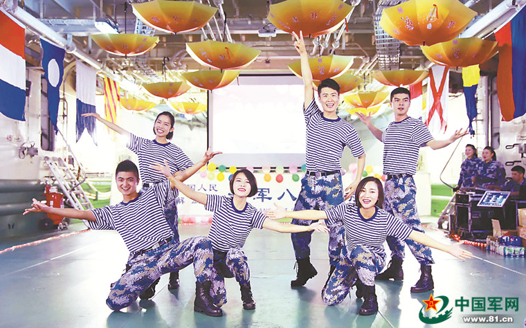 远航水兵在舰上排练文艺晚会。许双鑫摄