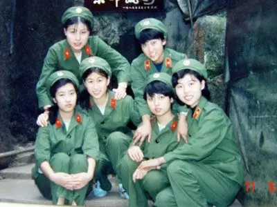 戴85式无檐帽的陆军女干部、战士(领章有黄边的为干部,无黄边的为战士)。