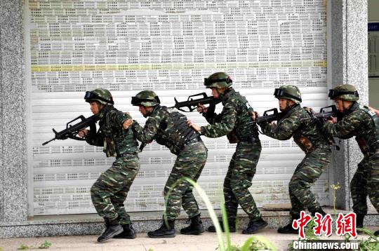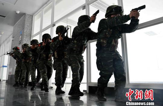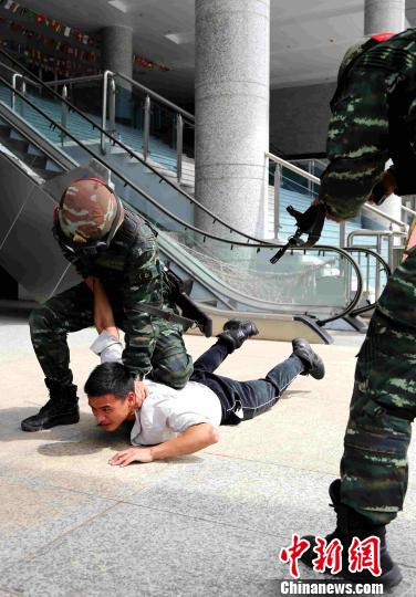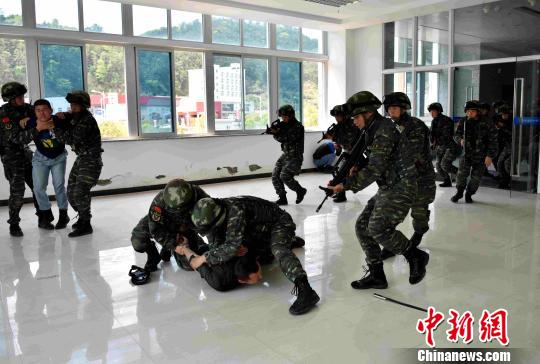 图为武警特战官兵在福建省南平汽车客运中心站开展反劫持战斗演练。 黄潮炜 摄