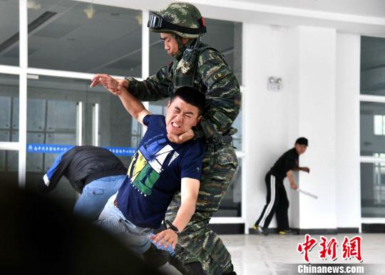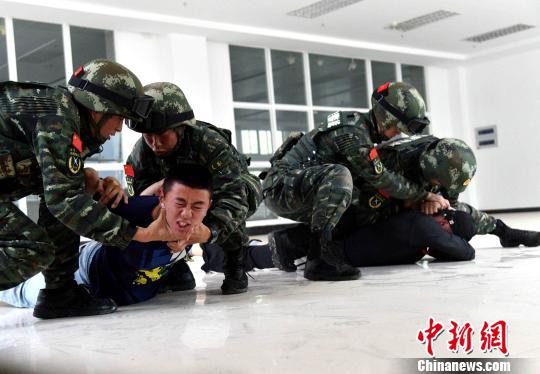 图为武警特战官兵在福建省南平汽车客运中心站开展反劫持战斗演练。 胡鑫 摄