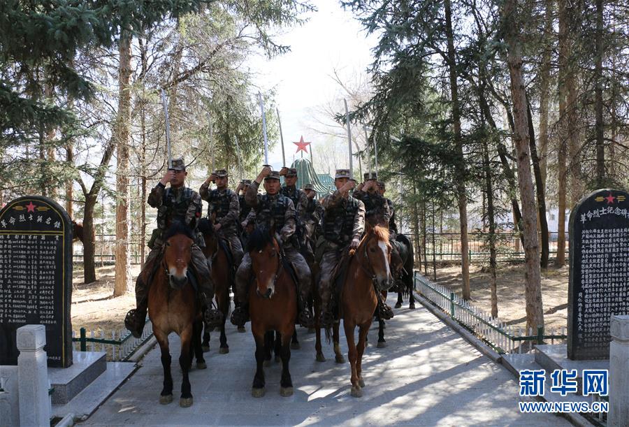 第76集团军某旅骑兵二营战士在青海省黄南州同仁县烈士陵园以骑兵举刀礼向先烈们敬礼(4月2日摄)。