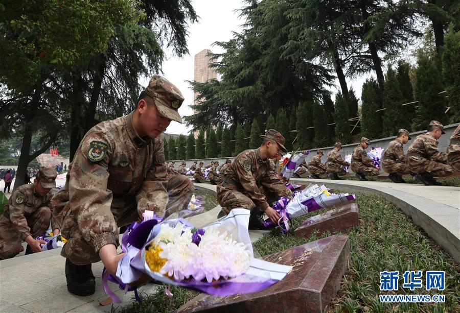 第72集团军某防空旅组织官兵在江苏镇江烈士陵园向英烈们献花(3月29日摄)。新华社发(童祖静 摄)