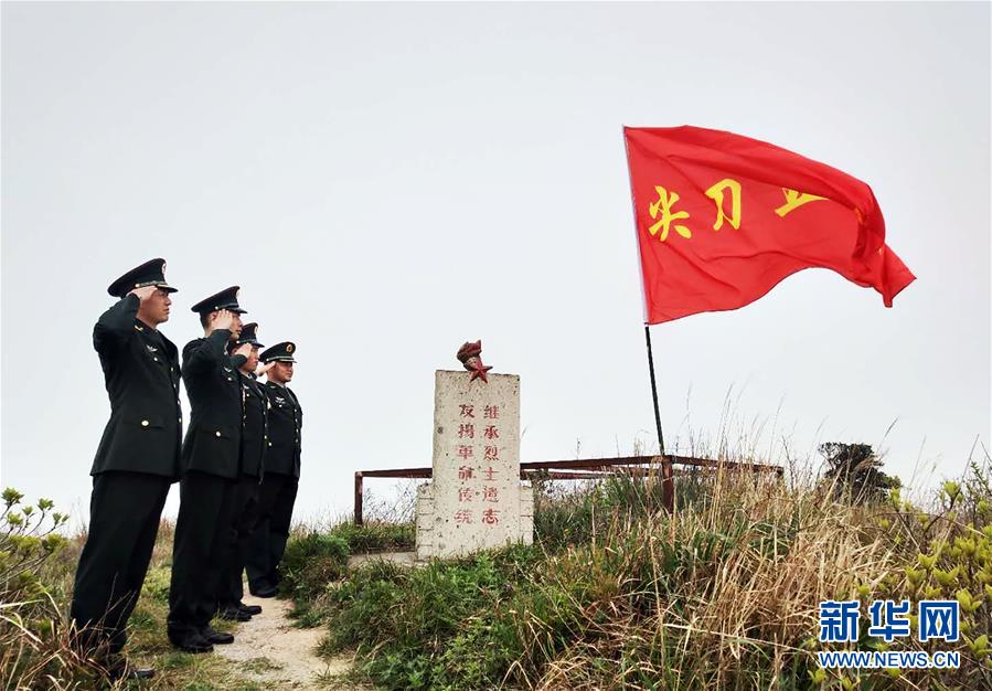 第83集团军某旅优秀官兵代表将英雄部队旗帜插上先烈战斗过的一江山岛主峰(3月30日摄)。新华社发(谷冲 摄)