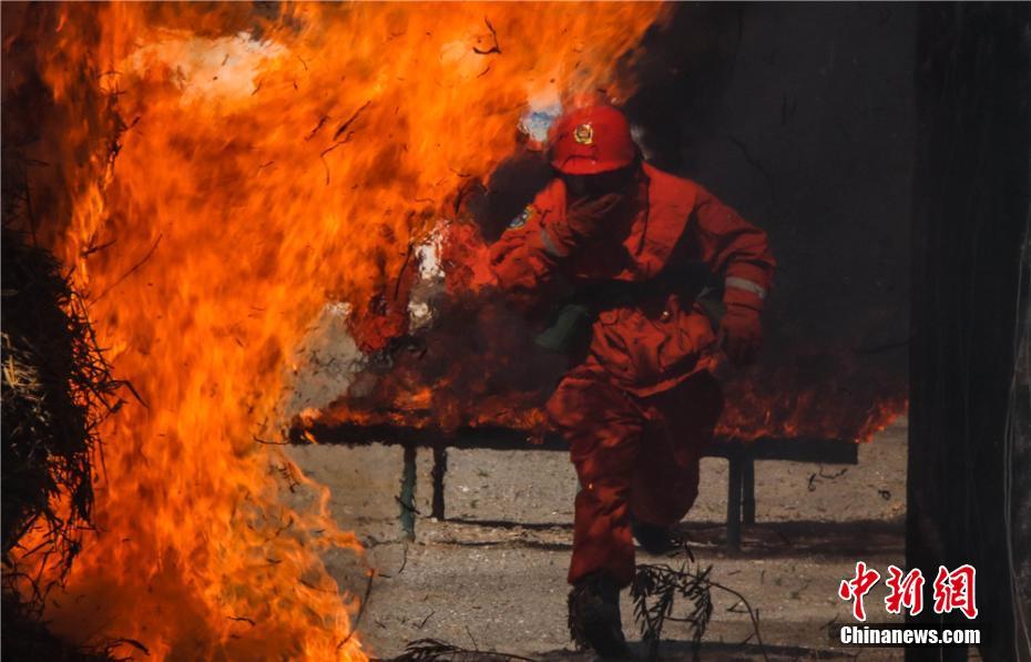 连日来,甘肃省武警森林总队陇南支队开展实战火场训练。春季风干物燥,极易引发火灾事故,该队通过设置逼真的实战火场环境,组织官兵开展“跃火墙、钻火圈、穿火林、跨火栏、冲火幕、过火廊”等训练,使官兵近距离接触真实火场环境,在强化应急反应能力的同时,不断锤炼紧急避险和险后应急救援本领。图为官兵通过火场障碍物。 李靠军 摄