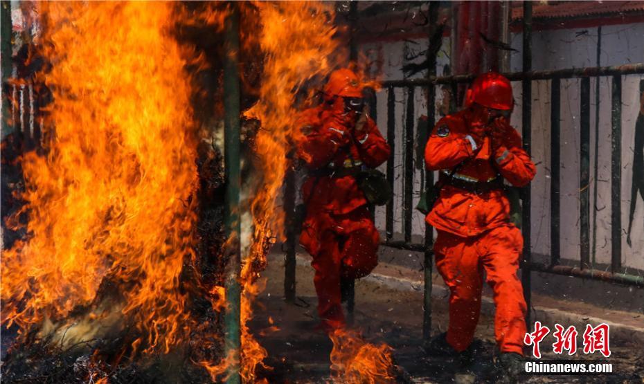 连日来,甘肃省武警森林总队陇南支队开展实战火场训练。春季风干物燥,极易引发火灾事故,该队通过设置逼真的实战火场环境,组织官兵开展“跃火墙、钻火圈、穿火林、跨火栏、冲火幕、过火廊”等训练,使官兵近距离接触真实火场环境,在强化应急反应能力的同时,不断锤炼紧急避险和险后应急救援本领。图为官兵在模拟火场中实战训练。 李靠军 摄