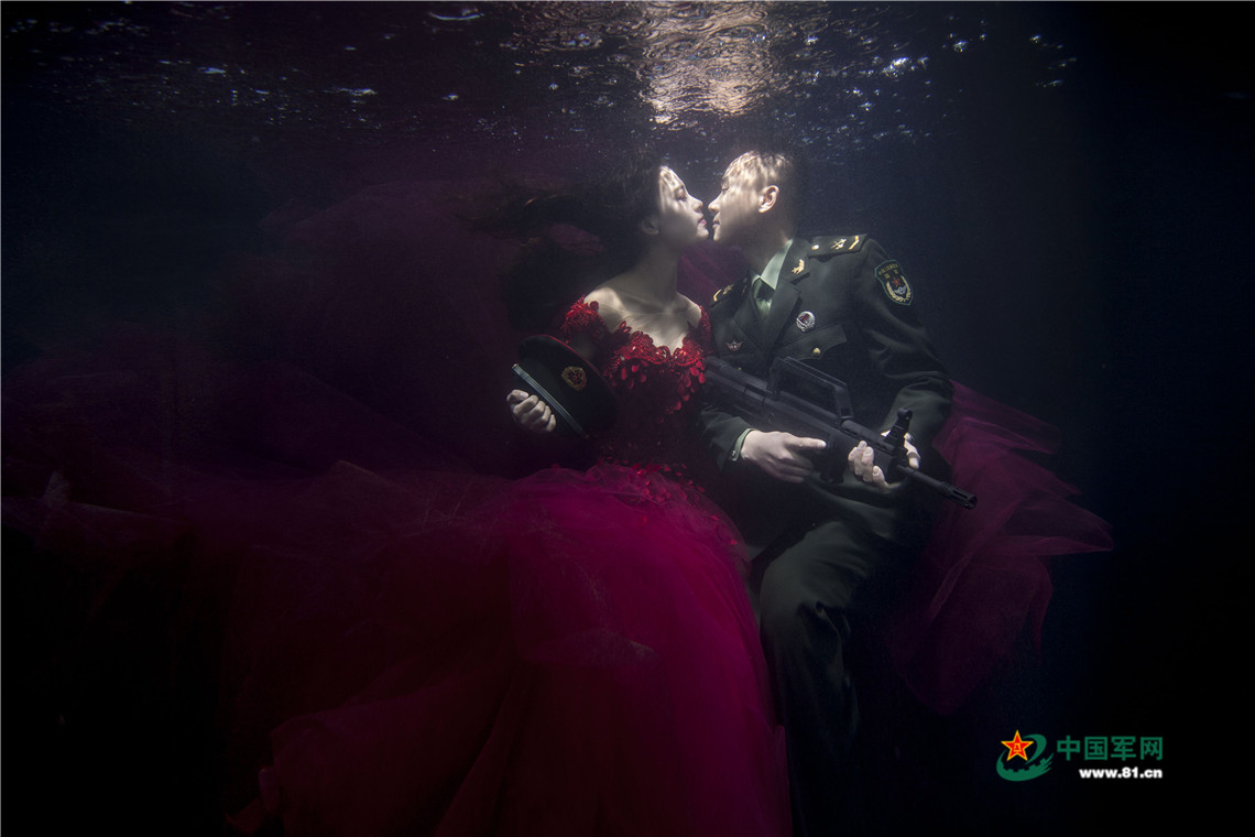 为兵哥和军嫂定制的军旅水下创意婚纱照(图中枪为仿真道具)