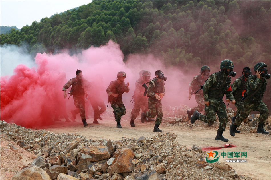 特战队员快速穿越染毒地区。