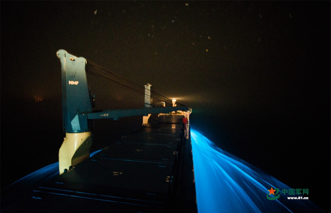 因为光线折射和海中浮游生物等多种原因,船附近的海面出现蓝光,这种情景在航行中并不多见。船员们幸运的看到了如此美景。