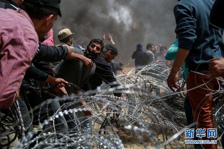 4月13日,巴勒斯坦人在加沙城东部与以色列接壤的边界地带试图拆除以色列设置的隔离铁丝网。当日,巴勒斯坦人在以色列与加沙地带交界处举行大规模抗议活动,并与以色列士兵发生冲突,以军士兵开枪或发射催泪瓦斯驱散人群时造成多人受伤。新华社发