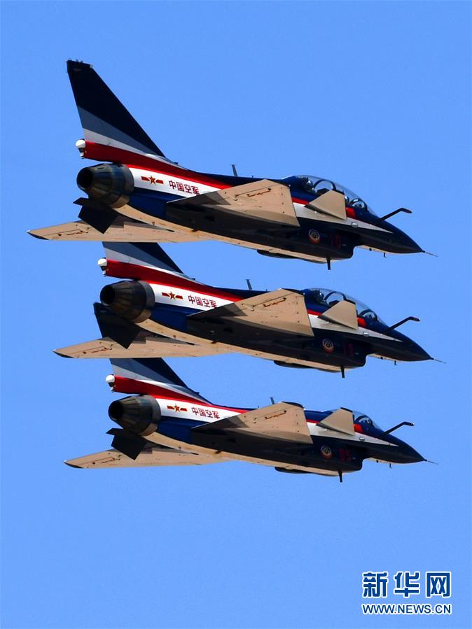 4月15日,在第三个全民国家安全教育日开放训练中,空军八一飞行表演队歼-10三机密集编队飞行。新华社发(刘川 摄)