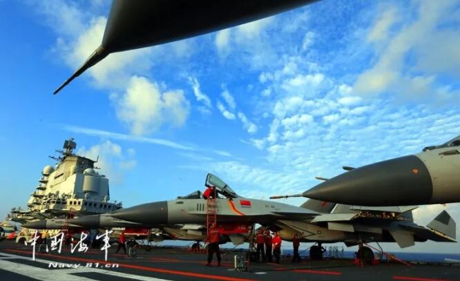 4月20日,海军辽宁舰编队在西太平洋,开展远海作战对抗训练。图为机务人员正在紧张有序进行安全检查,确保舰载战斗机正常飞行。记者张雷 摄
