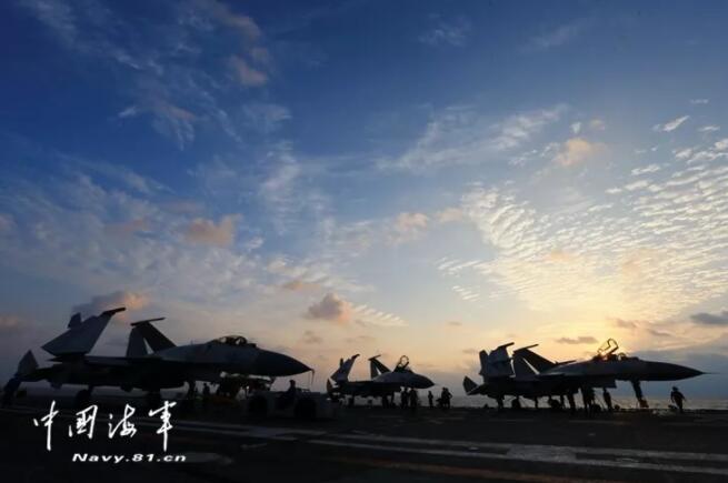 4月20日,海军辽宁舰编队在西太平洋,开展远海作战对抗训练。图为晨曦中的舰载机静待起飞。记者张雷 摄