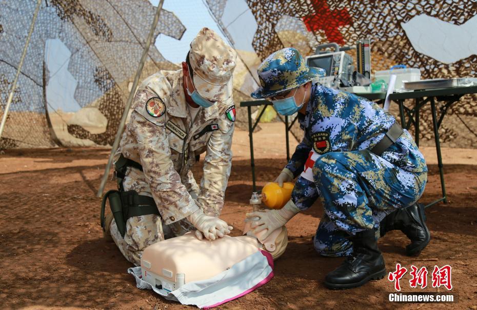 当地时间4月25日上午,中国人民解放军驻吉布提保障基地与意大利驻吉布提联合保障基地,举行“协作—2018.04.ITA”医疗救助联合训练。这是中国驻吉布提保障基地首次与驻吉外军开展联合训练。图为中意双方医疗队员正在进行心肺复苏训练。中新社发 张庆宝 摄