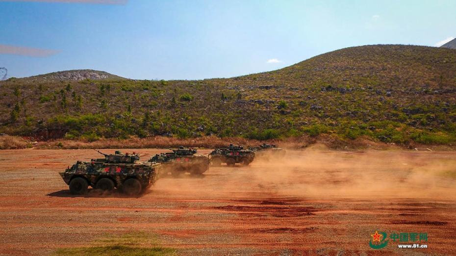 装甲车成梯形突击队形向前开进。黄海林 郭明卿 李岩 杨行 摄影报道 图片来源:中国军网