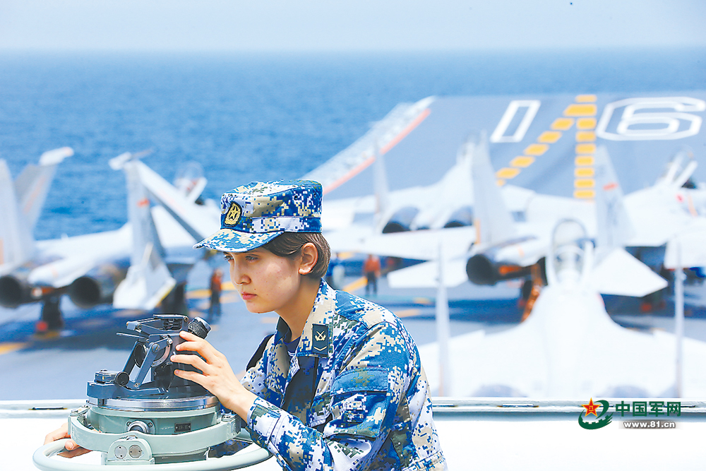 哈萨克族女兵加德热拉·哈布力利用陀螺仪观察海空情况。