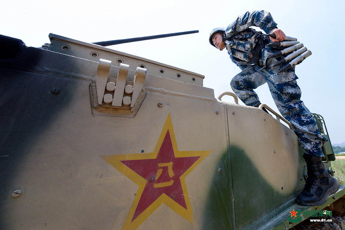 空降兵战车射手携弹登车。