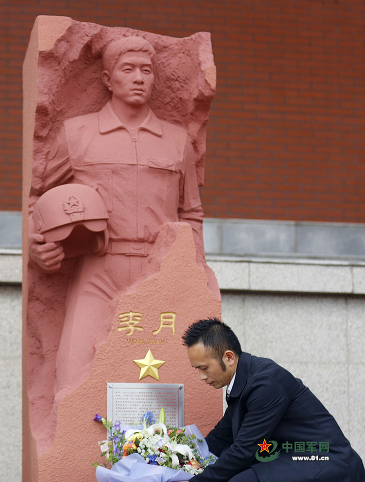 5月11日,纪念“5·12”汶川地震十周年暨李月烈士雕像落成揭幕仪式在四川成都列五中学举行。李月生前战友献花纪念。中国军网记者孙智英 摄