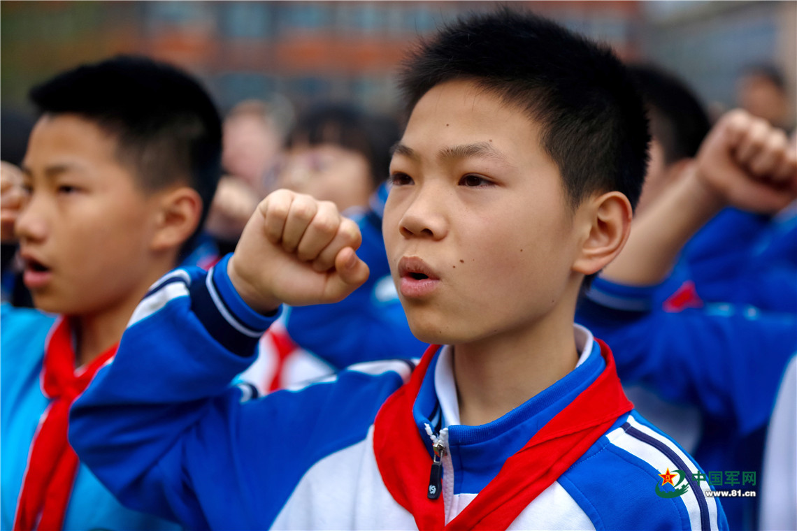 5月11日,纪念“5·12”汶川地震十周年暨李月烈士雕像落成揭幕仪式在四川成都列五中学举行,这是揭幕仪式现场,学生宣誓。中国军网记者孙智英 摄