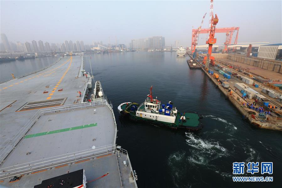 5月13日,我国第二艘航母从大连造船厂码头启航,赴相关海域执行海上试验任务,主要检测验证动力系统等设备的可靠性和稳定性。新华社发(胡锴冰 摄)