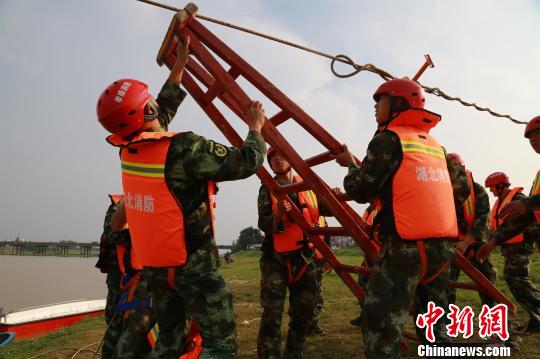 消防官兵搭建救生通道 王基达 摄