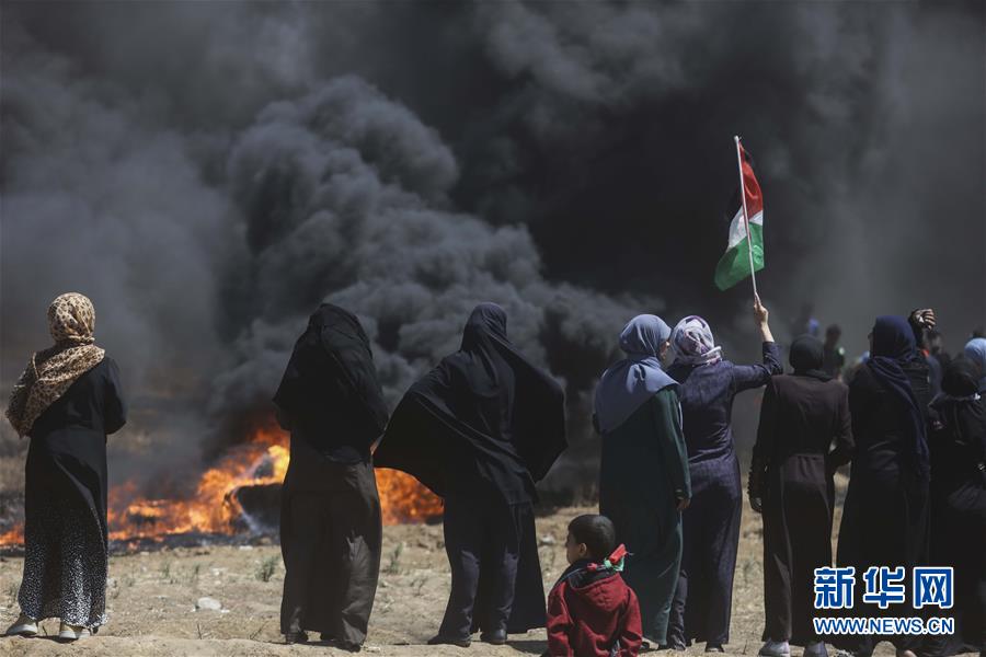5月14日,在加沙城以东的加沙地带与以色列边境,巴勒斯坦妇女参加示威活动。当天,巴勒斯坦民众在巴多地举行游行示威,抗议美国驻以色列使馆当天在耶路撒冷正式开馆。抗议者与以色列士兵发生冲突,导致至少55名巴勒斯坦人死亡、2800多人受伤。新华社发 维萨姆·纳萨尔 摄