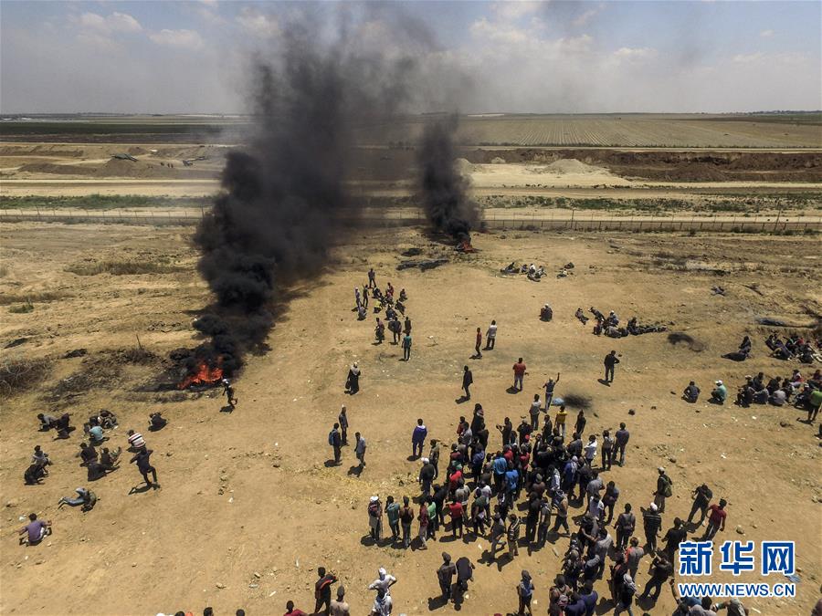 5月14日,在加沙城以东的加沙地带与以色列边境,巴勒斯坦民众参加示威活动。当天,巴勒斯坦民众在巴多地举行游行示威,抗议美国驻以色列使馆当天在耶路撒冷正式开馆。抗议者与以色列士兵发生冲突,导致至少55名巴勒斯坦人死亡、2800多人受伤。新华社发 维萨姆·纳萨尔 摄