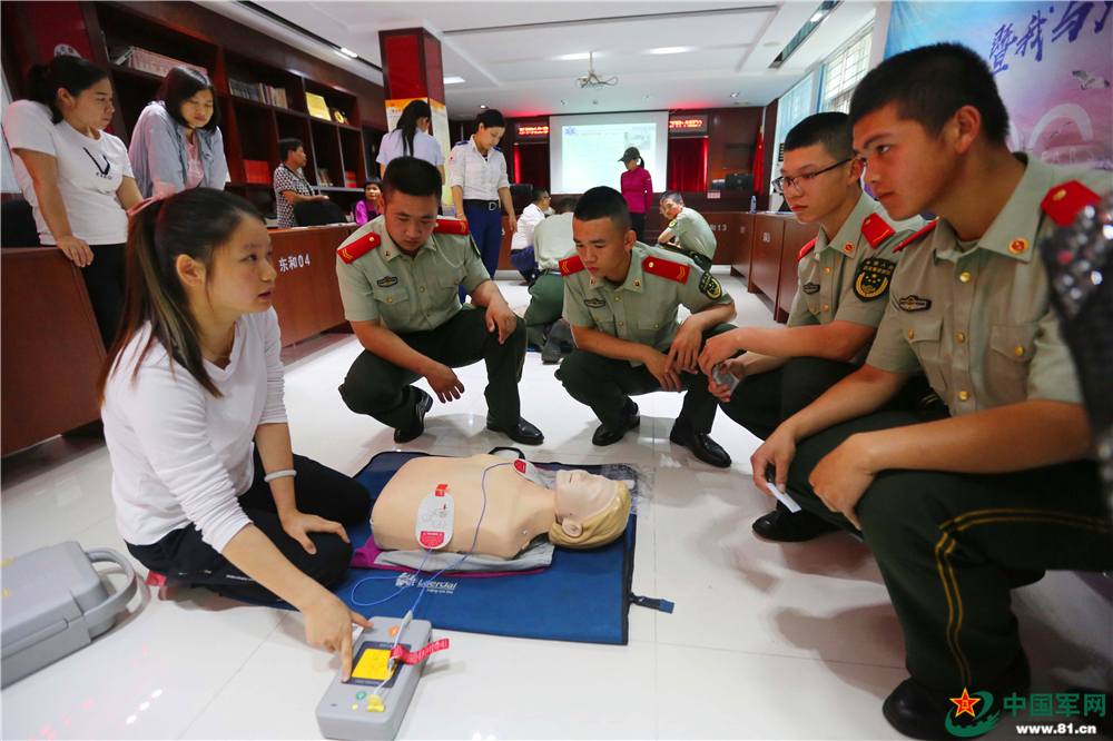 专家正在向官兵们讲授AED的使用方法。陈鹏 摄