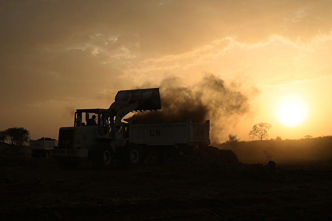 3月24日,在苏丹达尔富尔地区迈拉山腹地,中国第14批赴苏丹达尔富尔维和工兵分队官兵伴随着黎明的曙光开始工作。新华社发