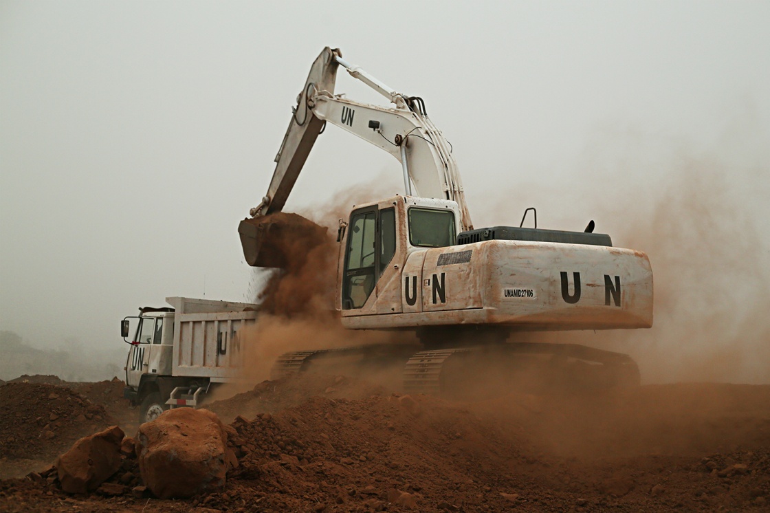 3月28日,在苏丹达尔富尔地区迈拉山腹地,中国第14批赴苏丹达尔富尔维和工兵分队官兵在漫天黄沙中施工。新华社发