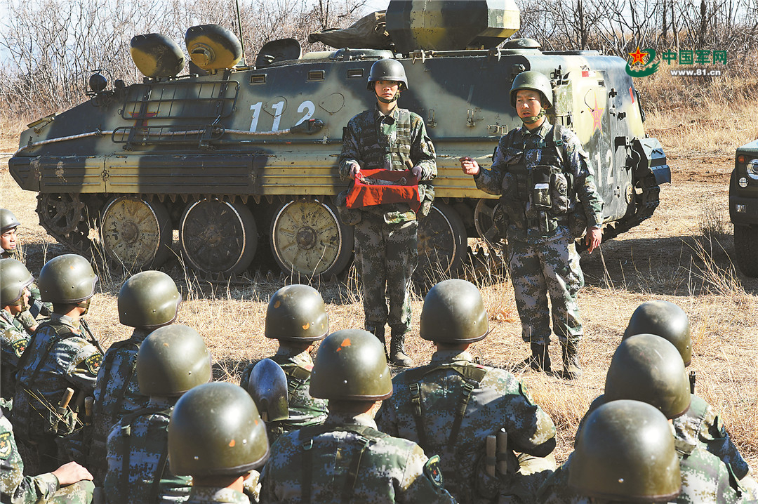 红一连指导员徐海龙(右)利用训练间隙向官兵讲述连队传家宝背后的故事。