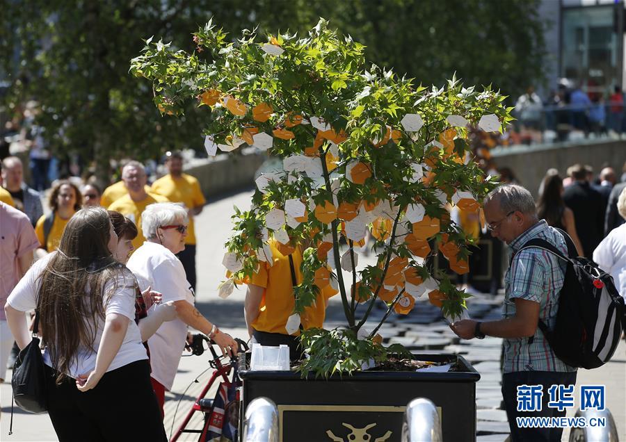 5月22日,在英国曼彻斯特,人们阅读系在“希望之树”上的留言。新华社发(克雷格·布劳摄)