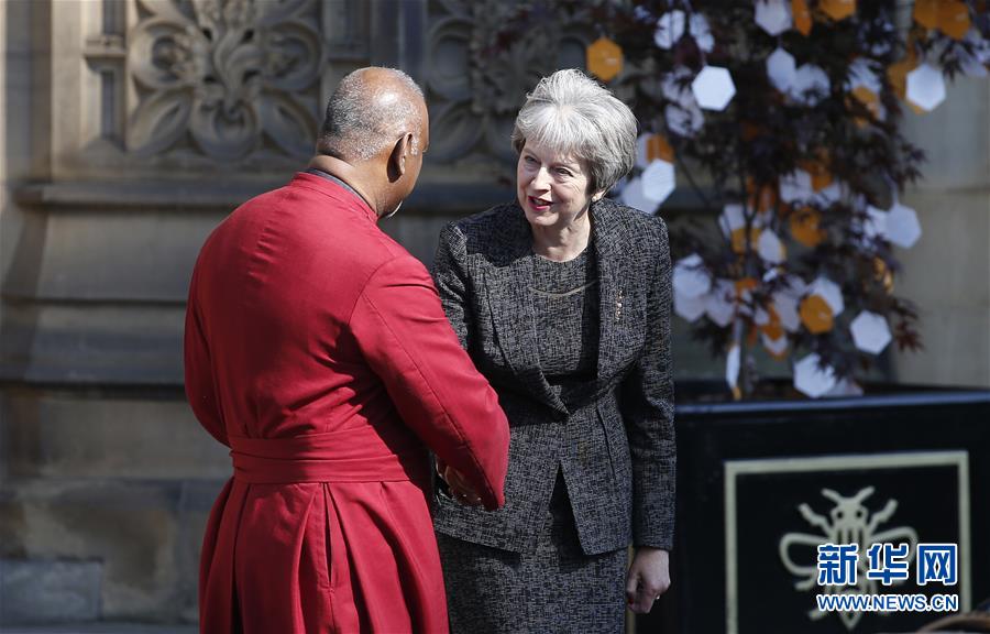 5月22日,在英国曼彻斯特,英国首相特雷莎·梅(右)出席悼念活动后准备离开。新华社发(克雷格·布劳摄)