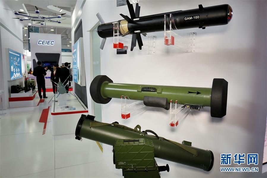 这是5月23日在哈萨克斯坦防务展上拍摄的保利科技有限公司的展品。新华社发(阿比洛夫摄)