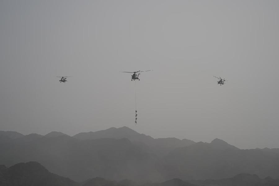 23日,陆军新质作战力量演练在陆军多个演兵场连续“打响”,8支新质作战力量轮番上阵。图为特战队员在武装直升机护卫下进行直升机悬吊撤离。新华社记者王东明 摄