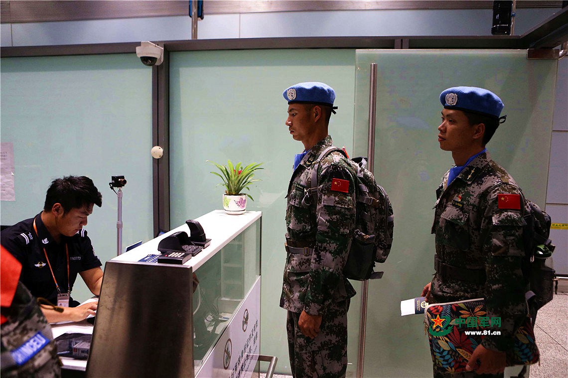 5月17日晚,云南昆明长水国际机场,我国第17批赴黎巴嫩维和部队官兵在进行安检。